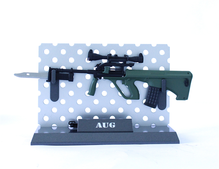 PAUG001 - MINIATURA RIFLE AUG- MINIATURA DE ARMADE GUERRA PARA COLECIONAR, COR OLIVA, EM ABS, VEM LUNETA E BAIONETA FACK C/ BASE PROPRIA