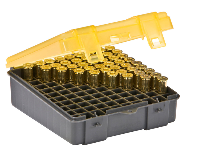 Caixa plástica para armazenagem de munição. Armazena de forma prática e segura até 100 munições de calibre 38 ou 357.