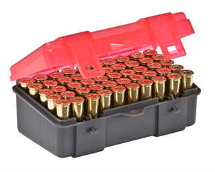 Caixa plástica para armazenagem de munição. Armazena de forma prática e segura até 50 munições de calibre 38 ou 357.