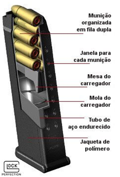 O CARREGADOR da Glock, além de ser muito leve (68g na G25) e compacto, é composto basicamente de um tubo de aço endurecido com uma jaqueta de polímero de alta tecnologia (o que aumenta a resistência contra deformação: como quando o carregador cai ou é exposto a ambientes com condições extremas).