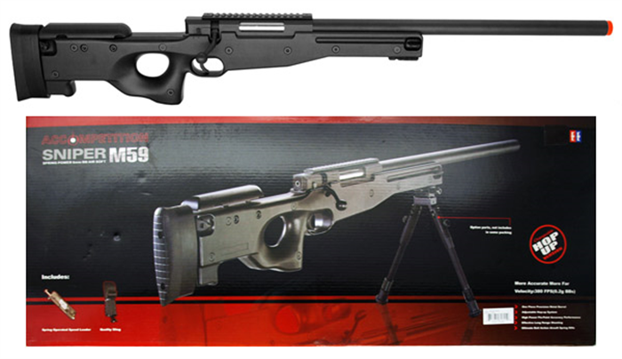 Modelo L96 M59A da marca Double Eagle, no calibre 6mm, modelo com trilho superior de 20mm, permitido a utilização da luneta, trilho inferior frontal de 20mm, permitindo utilização de bipé na mesma.