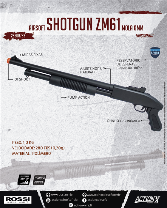 AIRSOFT SHOTGUN ZM61 é um equipamento com ação por mola disparando 1 BB’s por vez. Tem como diferencial o seu compartimento de munição que é direto no equipamento com capacidade para 100 BB’s, não possuindo magazine.
