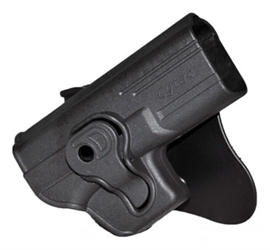 Coldre com mecanismo de trava de segurança para saque rápido produzido em polímero de nylon poliamida, injetado em peça única, com placa anatômica ou passador de cinto com regulagem de ângulo através de pré-encaixe dentado junto ao coldre com fixação final através de 01 (um) parafuso metálico tipo Allen. Coldre c/trava segurança com aba paddle.