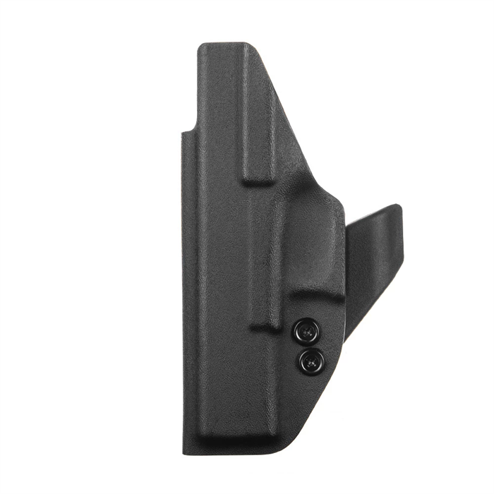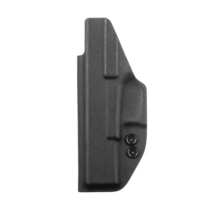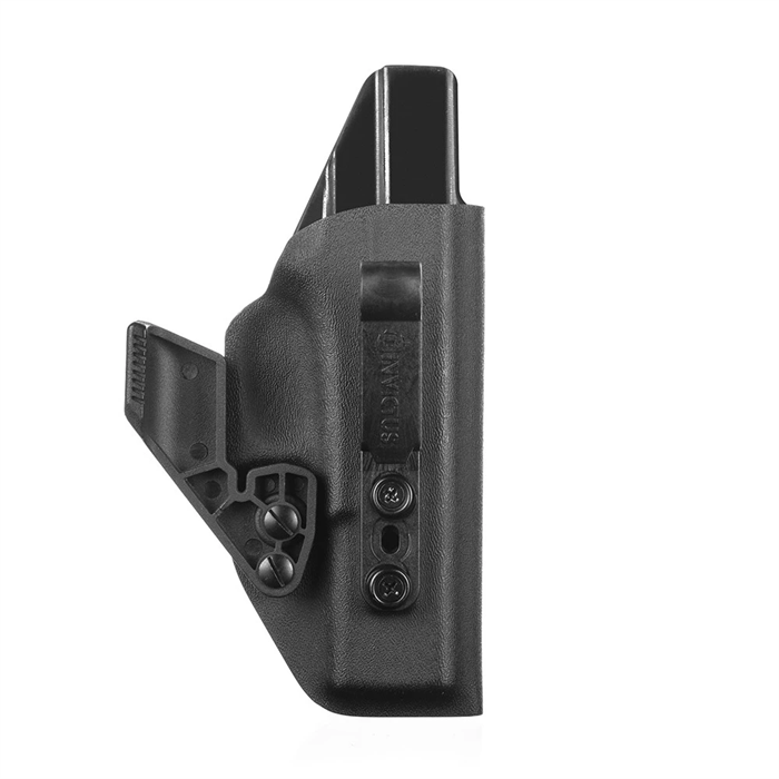 O Kydex® não deforma, não propaga chamas e é extremamente resistente ao impacto. Com duas opções de clip, um em polímero (POM), muito resistente, e outro clip metálico em aço inoxidável, com ajuste de ângulo. Ambos os clips possuem regulagem de altura.