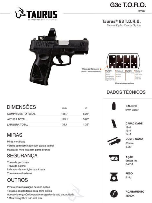 A Taurus lança no Brasil a pistola G3c na inovadora versão T.O.R.O. (Taurus Optic Ready Option). Modelo original de fábrica, projetado para receber diversas miras ópticas. A versão T.O.R.O. além de manter a originalidade evita gastos com customização.
