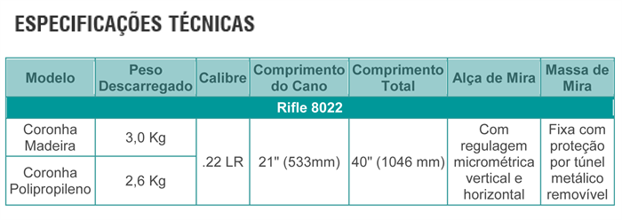O novo rifle 8022 Bolt Action possui sistema de repetição por ferrolho e é reconhecido pela excelente precisão nos disparos. Com baixo estampido e recuo praticamente imperceptível, é a opção ideal para o lazer, para as emocionantes sessões informais de tiro conhecidas como Plinking (tiro em latinhas) e iniciação no esporte do tiro. Sua versatilidade permite também que seja utilizado na caça de pequenos animais.
