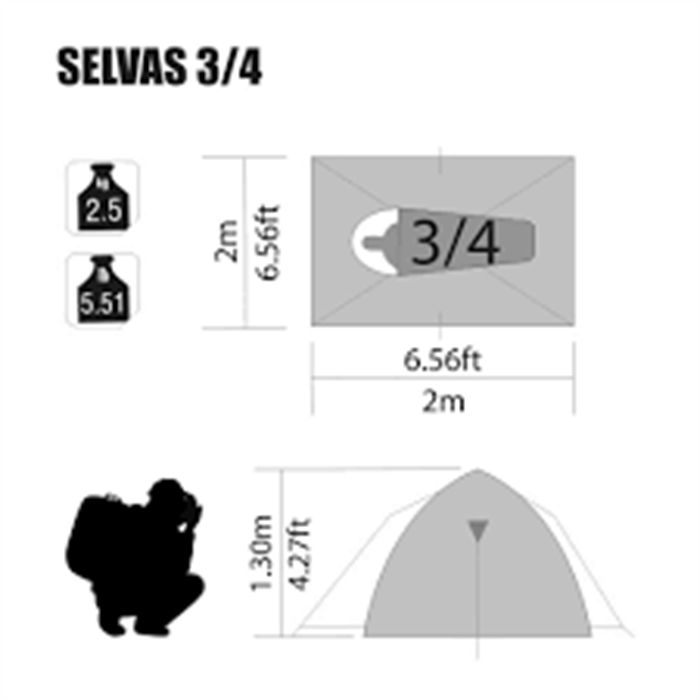 A estrutura da Barraca Selvas 3/4 é feita com varetas de fibra de vidro e o material do piso é confeccionado com polietileno de alta resistência. Internamente, o material usado é poliéster respirável, de modo a garantir mais uma noite de sono mais confortável. Além disso, possui bolso interno para organização de objetos.