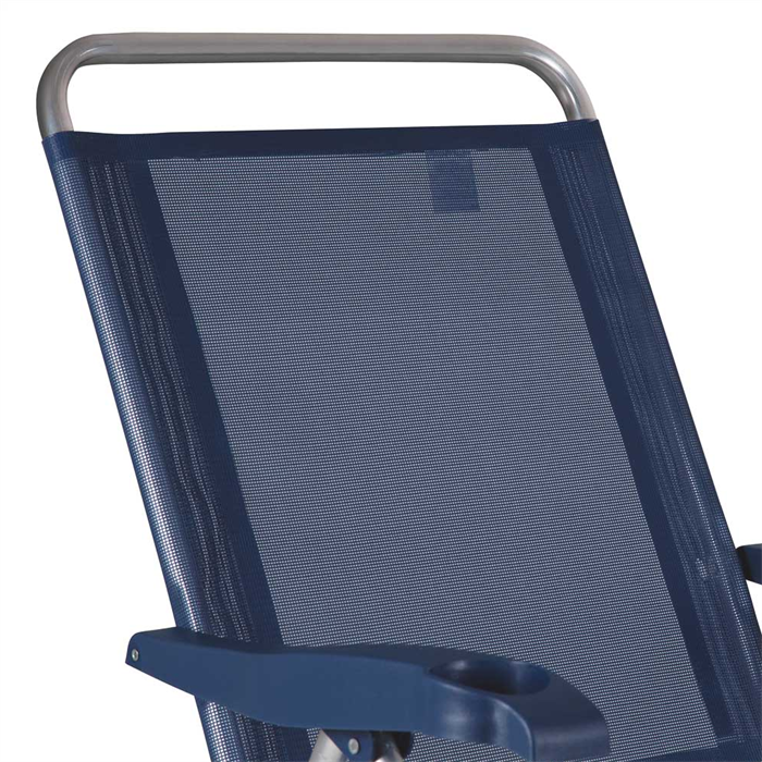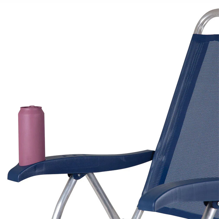 É ideal para dias de praia ou piscina. Suas peças plásticas são feitas em polipropileno e o braço, além de ter um porta-copos, possui regulagem para quatro posições de reclinação.