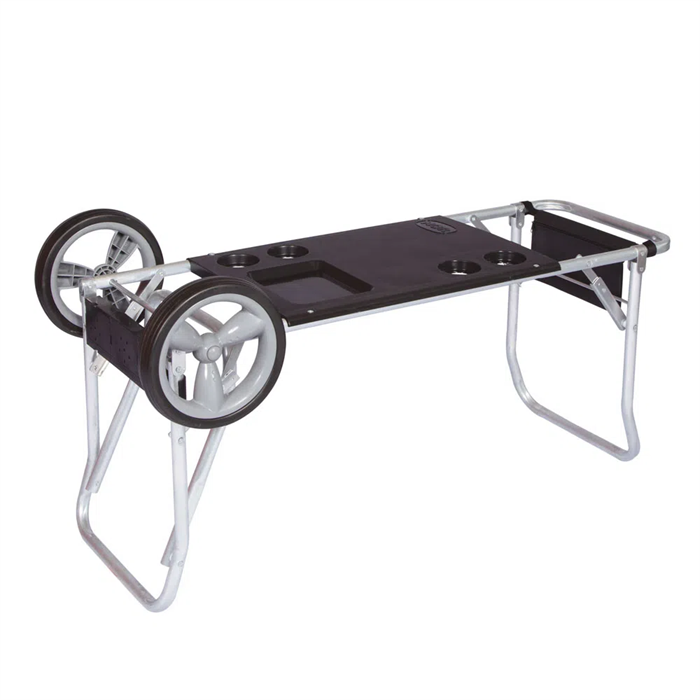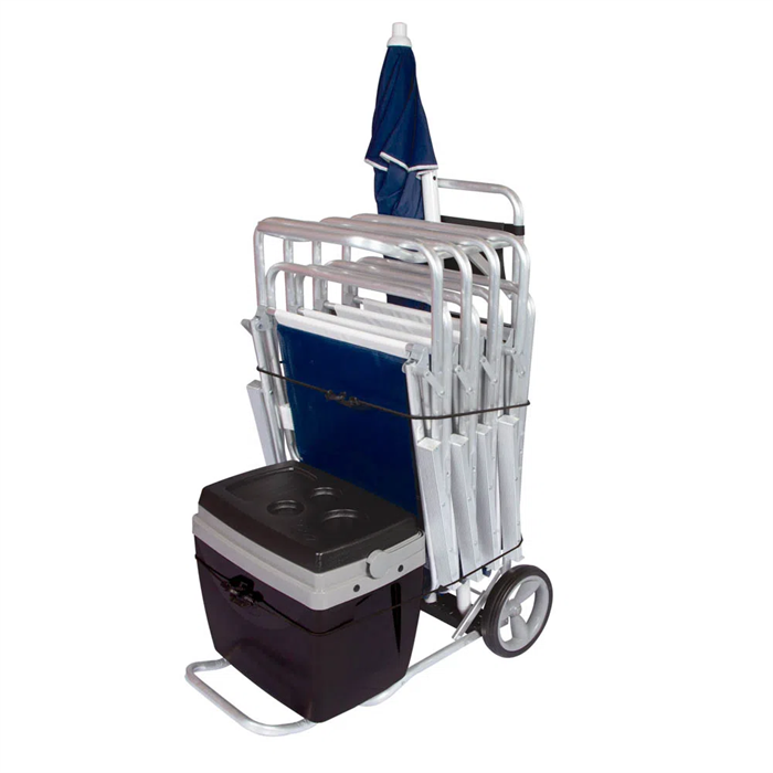 Além de carregar tudo o que precisa para curtir um dia na praia, seu carrinho se transforma em uma prática mesa com quatro encaixes para copos ou latas que chegarão geladinhas na sua caixa térmica.