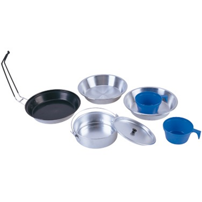 Conjunto: 1 frigideira com teflon, 1 panela, 2 pratos e 2 cumbucas plásticas