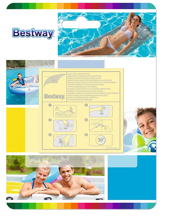 Chegou o Kit de reparo para infláveis da Bestway, prático, inclui 10 remendos reforçados excelentes para reparos em piscinas, spas, colchões e outros infláveis!