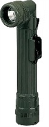 Lanterna militar de cotovelo verde oliva confeccionado em material ABS e resistente a intempéries, contém, lâmpada tipo Kripton, suporta alto impacto.