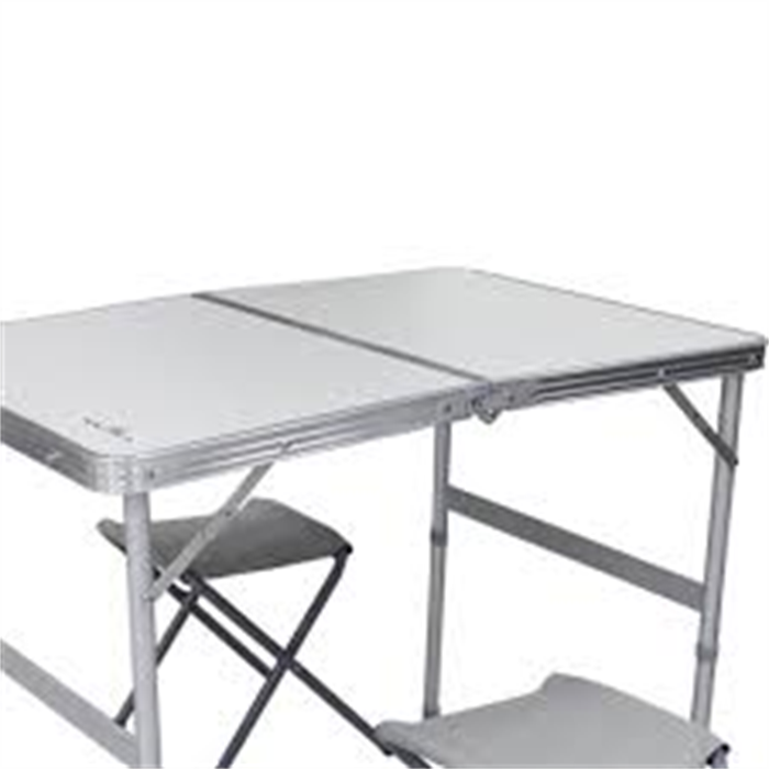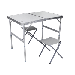 Sua estrutura é feita de alumínio, que garante a leveza do produto, e o tampo em MDF aluminizado. Já os bancos, sãatilde;o revestidos com tecido oxford. Fácil de instalar e montar, a Mesa Domo é prática desde seu transporte até o uso e desmontagem.