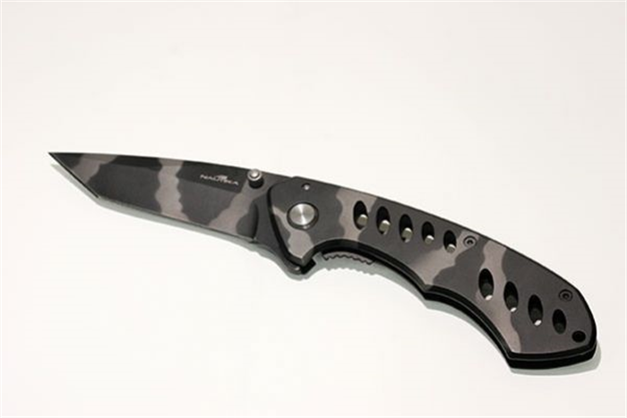O Canivete Aura, da NTK, possui lâmina tipo turca forjada artesanalmente. Possui trava de segurança e sistema de abertura rápida com uma mão apenas e clip para pendurar na mochila ou no cinto.