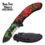 Canivete assistido semi serrilhado tala em alumínio caveira vermelha.