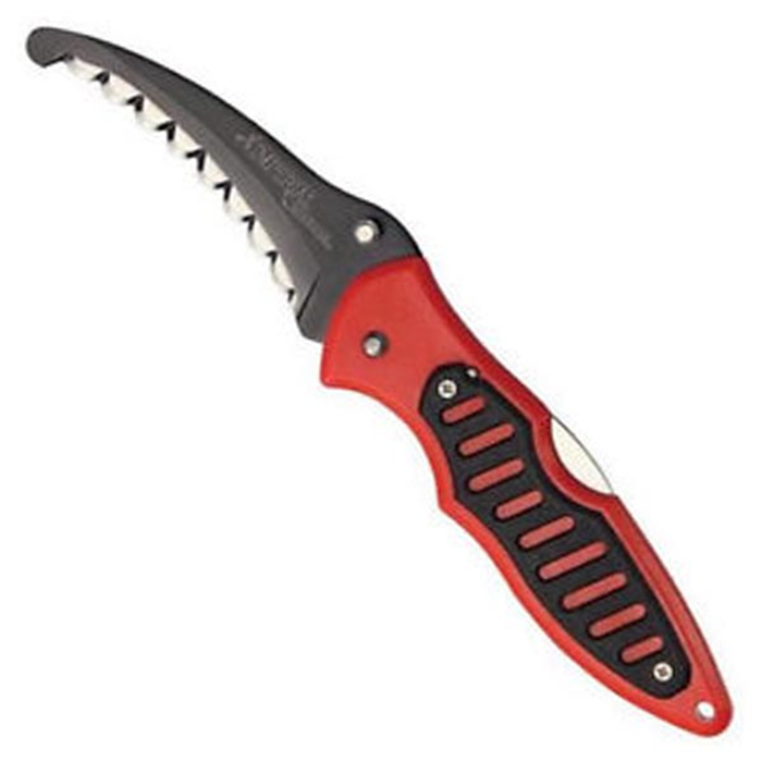 Canivete de resgate Imperial modelo IMP0022CP. Contém lâmina serrilhada em aço inox 420 na cor preta. Empunhadura de polímero na cor vermelha com detalhe preto. Possui pino de abertura destro e clip de bolso lateral removível de uma posição.