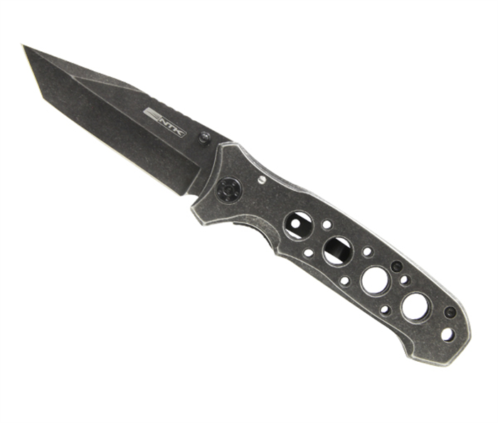 O Canivete tático Force, da NTK, acompanha estojo de metal, lâmina tipo tantô, clip para pendurar na mochila ou cinto, trava de segurança e sistema de abertura com apenas uma mão.