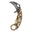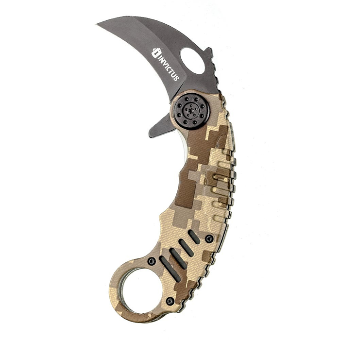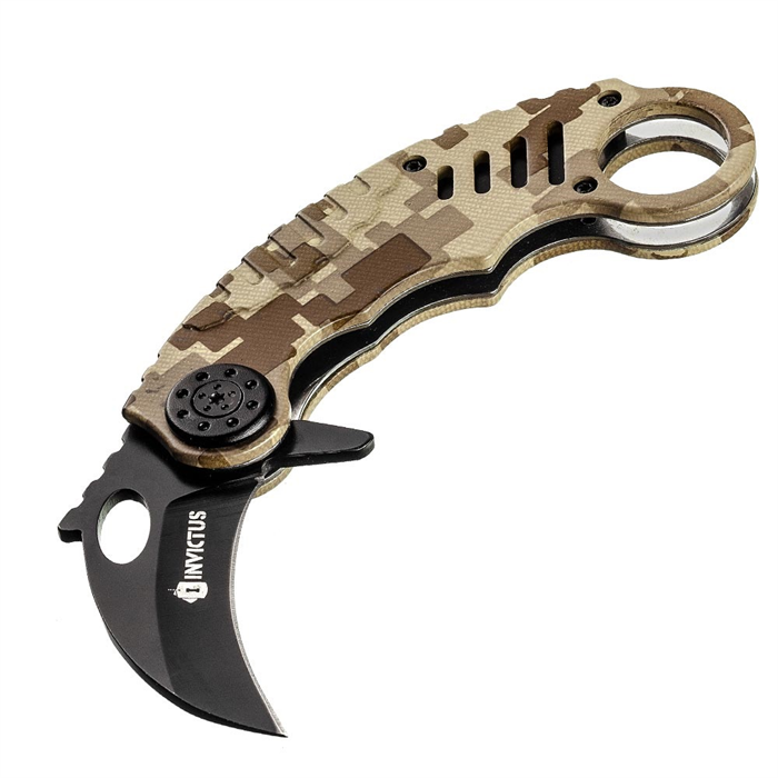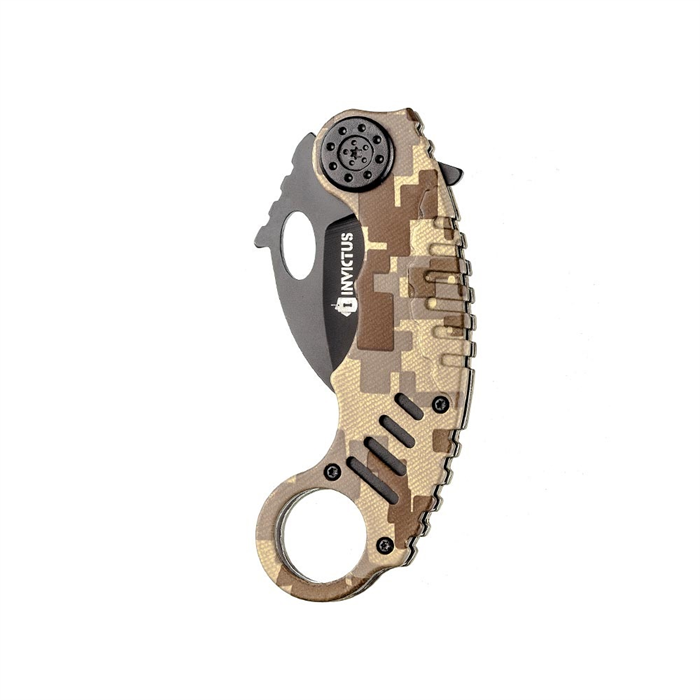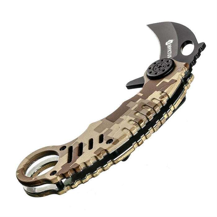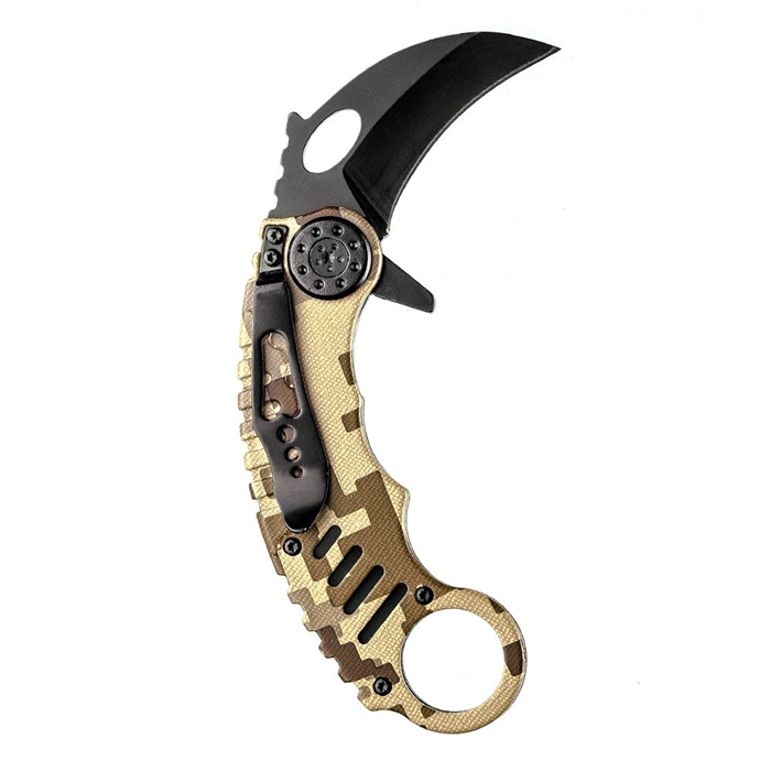 Canivetes estilo Karambit são clássicos táticos muito utilizados em defesa pessoal. Sua lâmina em aço inoxidável 420 tem 5 cm de comprimento, 2,5mm de espessura e seu nome é inspirado na silhueta de um bico de corvo. Seu cabo possui 11,5cm e é desenvolvido em camo, com acabamento “digital deserto”. Para dar ainda mais agilidade em sua abertura, o canivete possui sistema de acionamento assistido “spring assisted”.