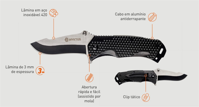 O canivete Honor compõe o portfólio de canivetes outdoor INVICTUS. Tem design robusto. Possui lâmina em aço inoxidável 420 com acabamento inox e preto, cabo em alumínio texturizado, clip tático, orifício para fiel e abertura fácil e rápida assistida por mola (spring assisted).