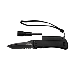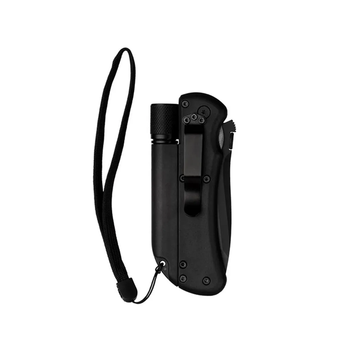 O canivete Survival da Guepardo possui revestimento tático, trava liner lock, mini lanterna em LED, pedra para faísca, pederneira, apito de emergência, cordão em nylon, com clip passador e trava de segurança manual.