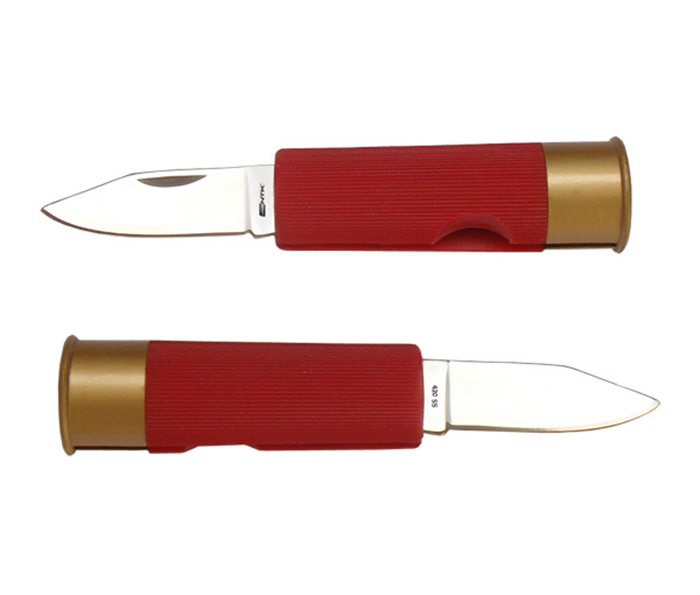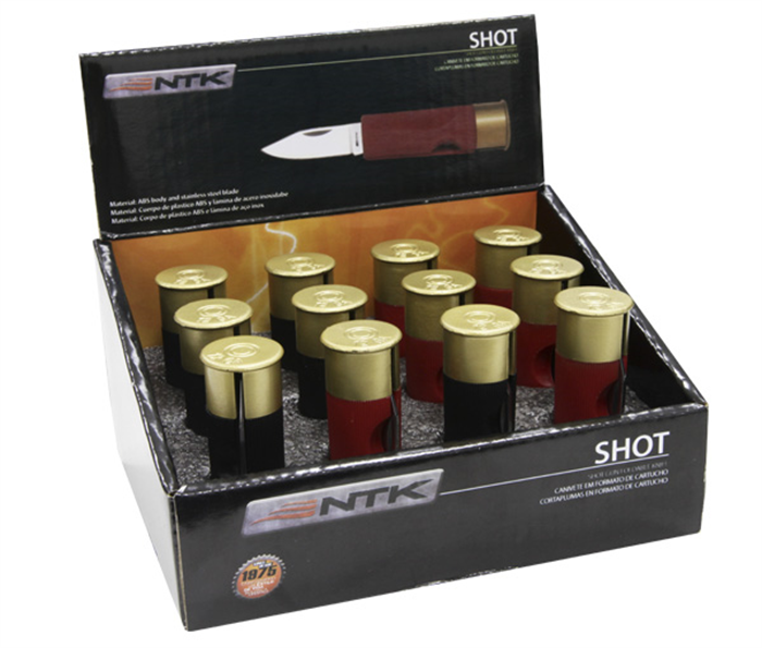 O Canivete Shot, da linha NTK Tático, possui embalagem tipo PDV com 12 unidades, canivete em formato cartucho 12GA com a coloração preta e a coloração vermelha.