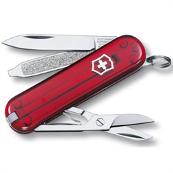 Elegante canivete suíço original na cor vermelha com acabamento translúcido. Contém as principais funções para auxiliar o seu cotidiano. Com argola para ser utilizado como chaveiro. Possui o diferencial na mesma ferramenta da lixa de unhas, uma chave de fenda pequena (2mm) ao invés do convencional limpador de unhas.