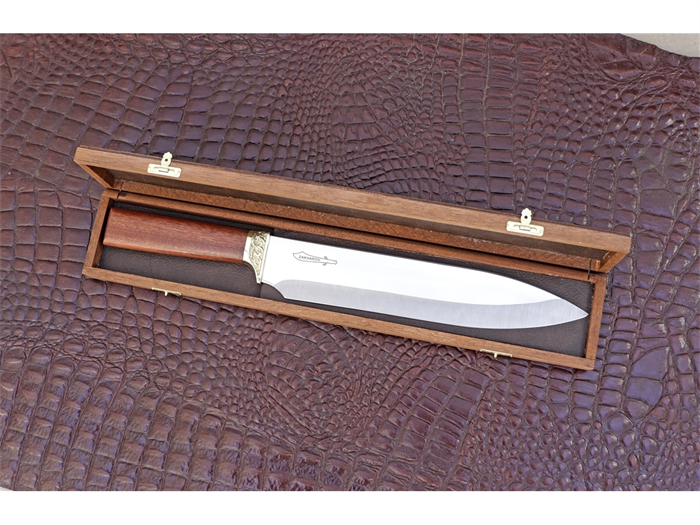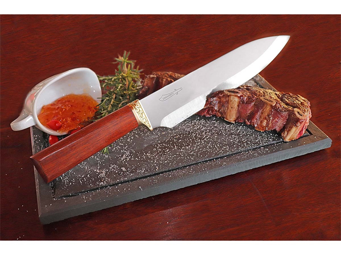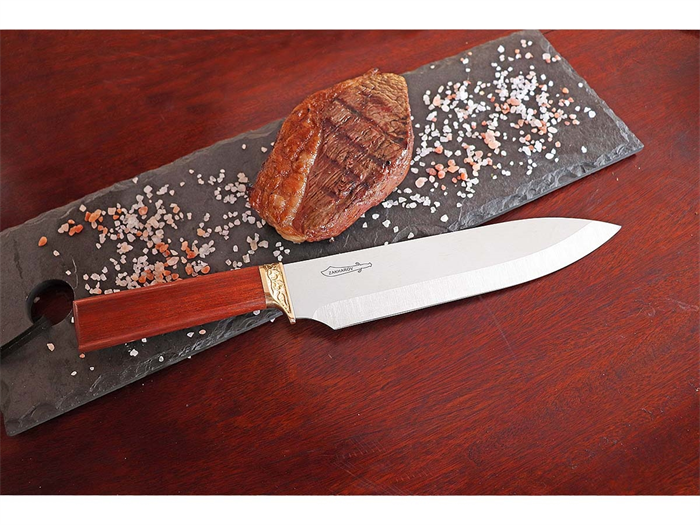 Sua lâmina de 25 cm de comprimento, é construída com um dos melhores aços do mundo indicados para cutelaria, tem alto poder de corte e precisão, podendo ser utilizada para várias ocasiões na Cozinha.