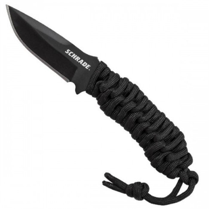 Faca de pescoço com cabo em corda e bainha em kydex. Tamanho total: 15,2 cm. Tamanho da lâmina: 6,2 cm. Material da lâmina: Aço inox 9Cr18MoV. Garantia: 6 meses. País de origem: China. Fabricante: Schrade