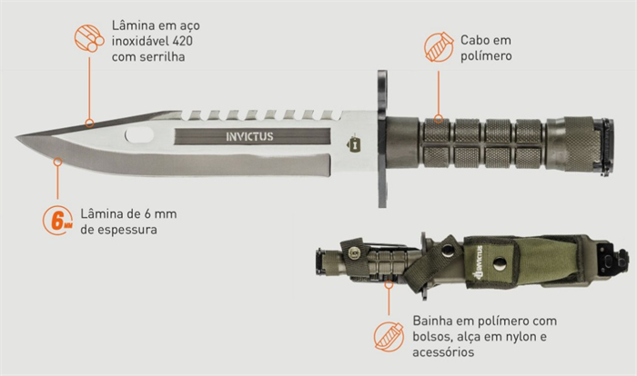 A faca Explorer compõe o portfólio de facas INVICTUS para uso tático e outdoor. É uma faca completa e permite usos diferenciados. Conta com lâmina em aço inoxidável 420, de maior resistência a impactos e maior durabilidade e cabo em polímero. A bainha, também em polímero, possui sistema de fácil encaixe, permitindo que o usuário acomode a faca em qualquer posição, bolso destacável, alças em nylon e acessórios como adaptador de cinto, alavanca corta arame, presilha de saque rápido e pedra de amolar. Além das funcionalidades descritas, a faca Explorer ainda pode ser utilizada como baioneta.