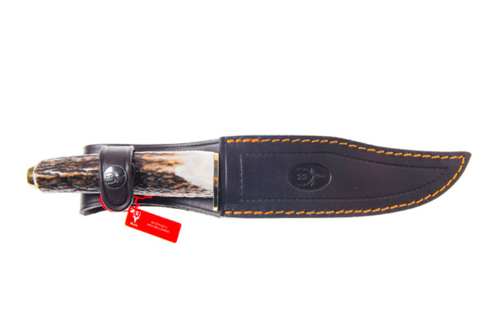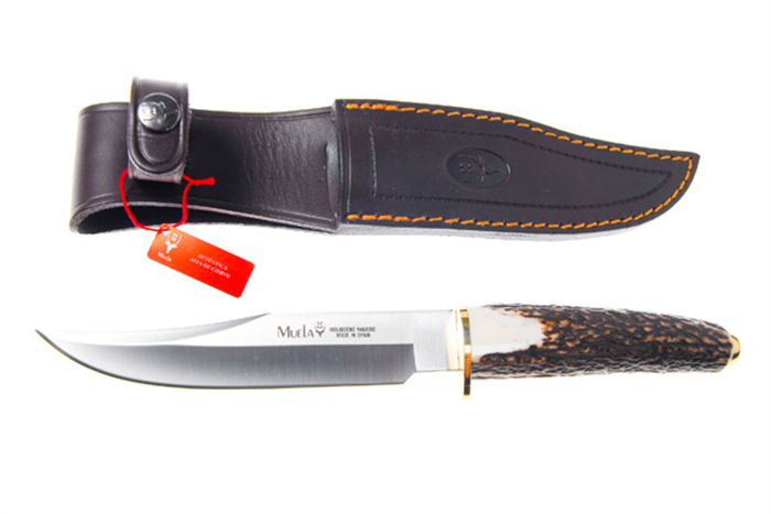 Faca esportiva Muela estilo Bowie, modelo SH 16, com cabo inteiriço de chifre de cervo, guarda mão simples e pomo em latão. Lâmina em aço 440 Molibdênio Vanádio. Excelente faca de uso geral em pesca, caça ou camping. Acompanha bainha de couro.