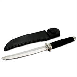 Faca Tanto lâmina e guarda em aço inox, cabo de borracha e bainha em couro.