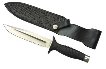 A faca de caça tem lâmina larga e fixa.