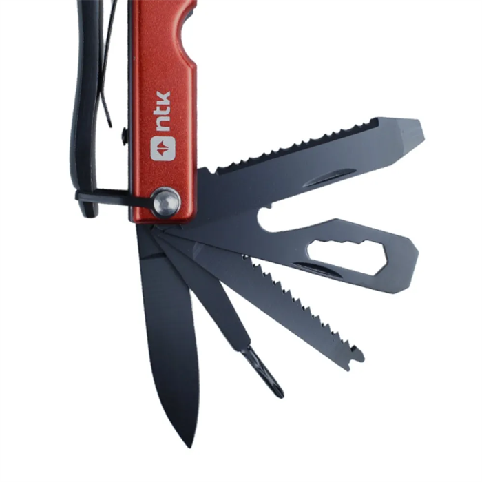 - Funções adicionais: Martelo, machado, alicate, chave phillips, cortador de fio, abridor de garrafa, faca, serra, lima e descamador de peixe