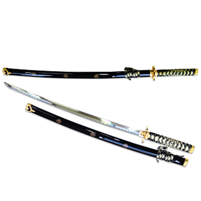 Lâmina 28" de aço inox 440, detalhes banhados a ouro 24 K na bainha, cabo e guarda, cabo decorado c/fita trançada e bainha c/ acabamento marmorizado. Tamanho total: 41" -Cor: Preta