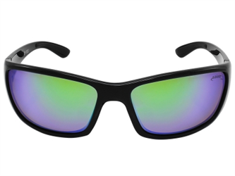 Armação preto brilho com lentes espelhadas na cor verde.
