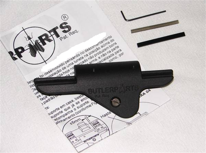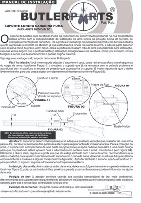 Ajustes: O suporte foi desenvolvido para que se adeque a qualquer variação que possa ter de uma arma para outra, por isso foi colocado dois parafusos allens para regular antes de instalar a luneta. Para a proteção da arma, o suporte vem acompanhado de uma haste de nylon para que apoie na base da culatra e uma haste de aço para que os parafusos allens apoiem nela e não fiquem em contato com a arma, marcando-a.