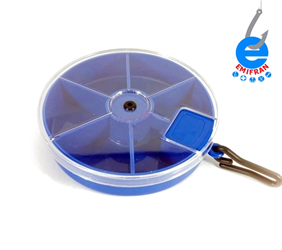 Estojo giratório com 6 compartimentos,  tampa transparente  e alça para pendurar.