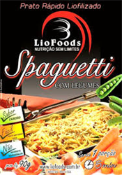 Prato rápido liofilizado sabor spaguetti com legumes que serve até 1 porção.