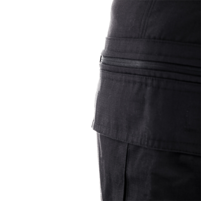 9 bolsos (2 cargo laterais, 1 lateral menor, 1 zíper embutido, 2 faca frontais, 1 canivete embutido, 2 traseiros)