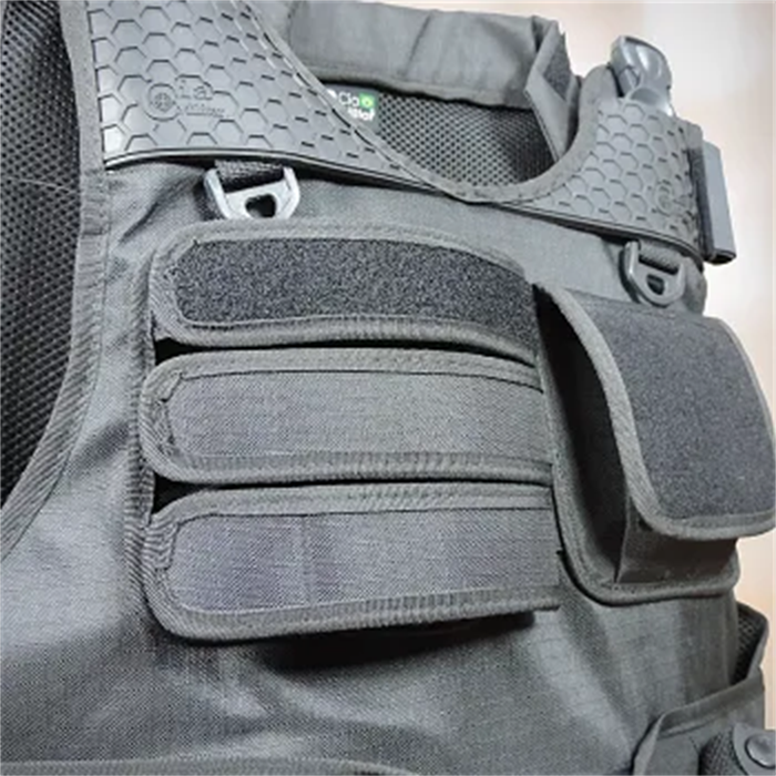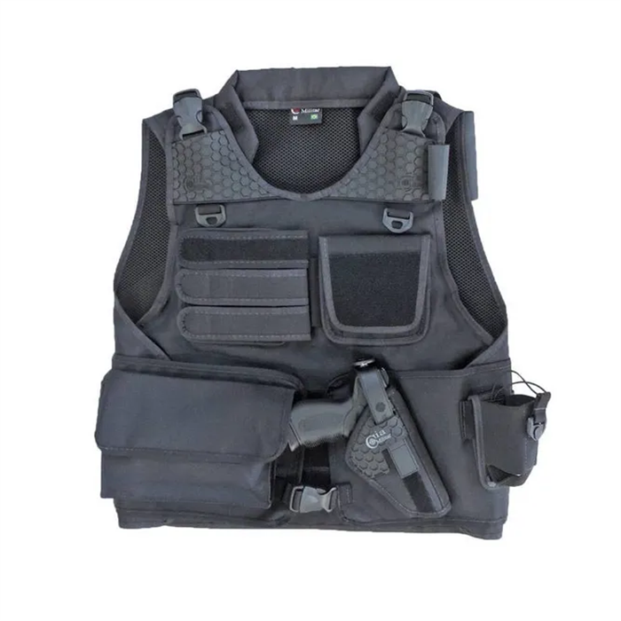 - Três portas carregadores para pistola e bolsos frontais com fechamento em